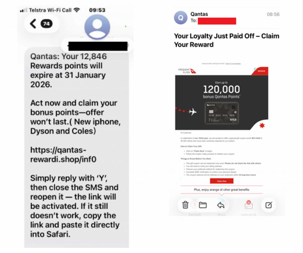 - Limited-time offers creating urgency such as expiring loyalty points or “missing out” on a refund or gift.